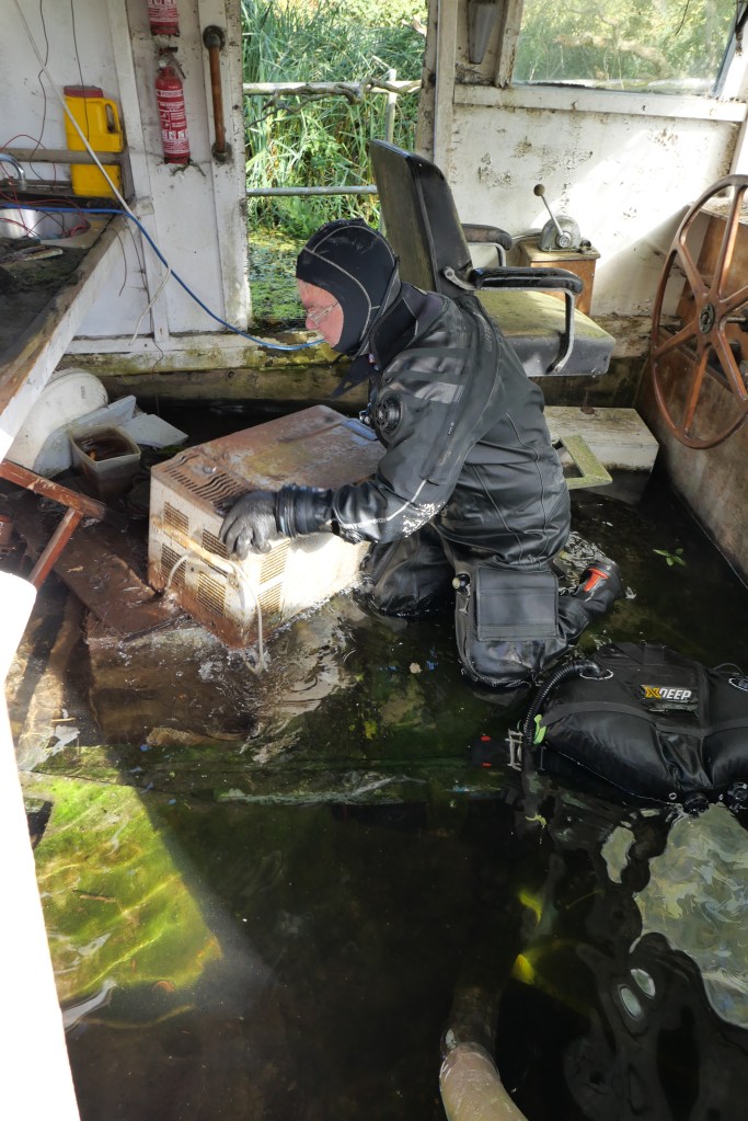 The verdict after the dive was positive, apart from having to move the odd fridge to gain access Nick managed to get to the interior and most of the exterior apart from half the hull length that was hard up against the bank. The problem was visibility, the broads were so silty that as soon as the diver entered the water he was left to use finger tip searching of the hull as you could not see anything even with a powerful torch.