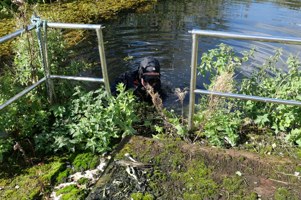 So three of us turned up on what we thought was a chilly September morning (little did we know how bad it would be on subsequent visits!) partly to clear some of the vegetation from the decks but mainly so Nick could dive