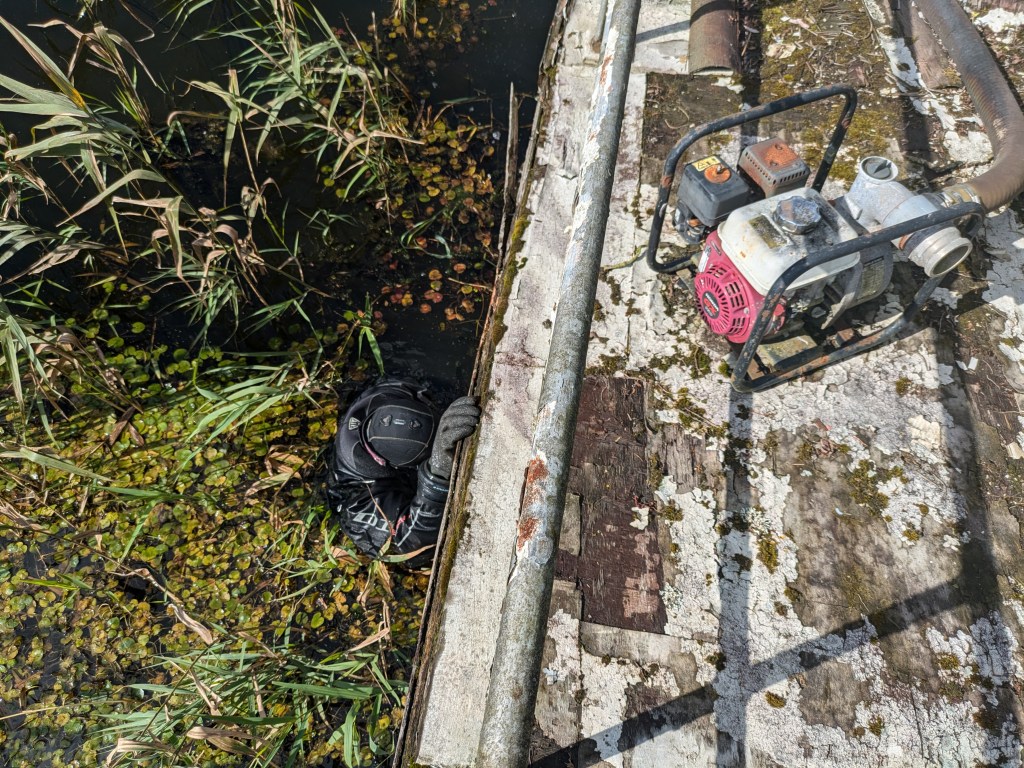 Nick disappeared nto the murky and cold water to try and find and plug any holes that the pumping uncovered